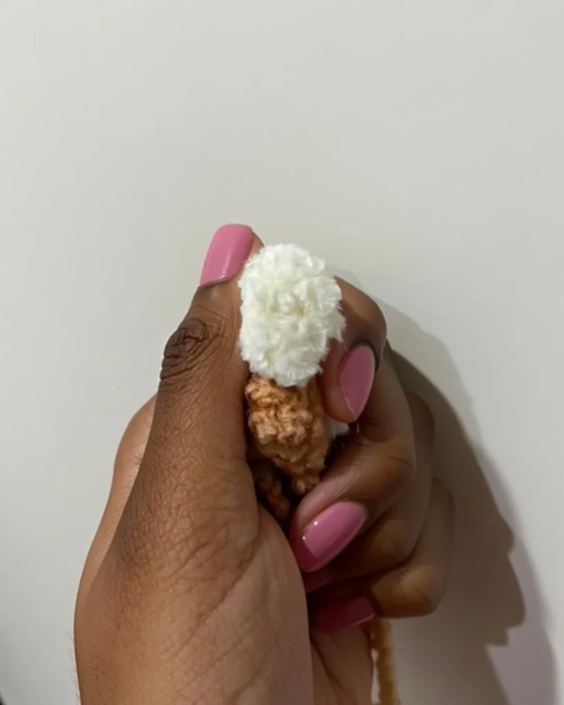 Attaching the Snout: Position the white snout on the front of the head between the safety eyes. It should sit between rounds 9 and 11 of the head. Using the long tail you left on the snout, sew it securely to the head using a whip stitch or mattress stitch. Make sure it’s centered between the eyes and sits flat against the head.