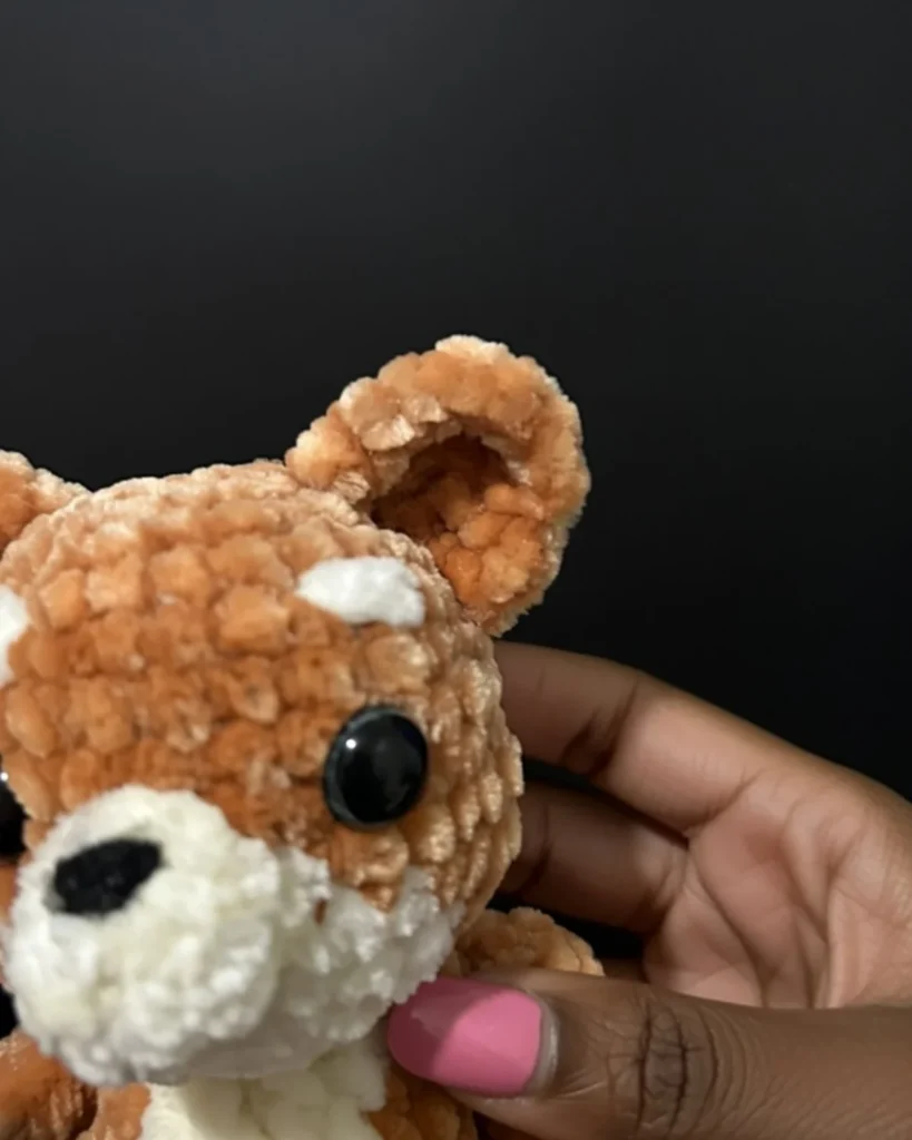 Attaching the Ears: Position the ears on top of the head between rounds 2 and 7. The inside edges of the ears should align with the placement of the safety eyes, creating a symmetrical appearance. Make sure both ears are angled slightly outward for that characteristic Shiba Inu alert expression. Sew securely using the yarn tails, working around the base of each ear to attach it firmly to the head.