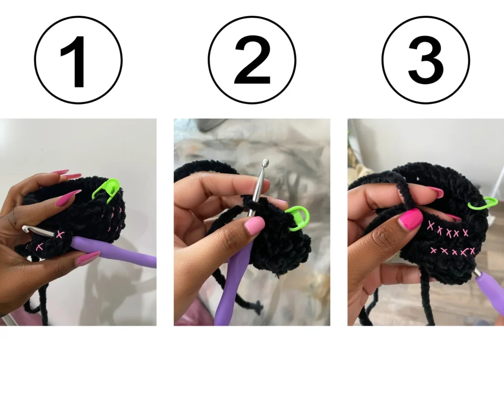 This technique joins the arms to the body seamlessly. The images in the original pattern show exactly how to position your hook through both the arm and body stitches.